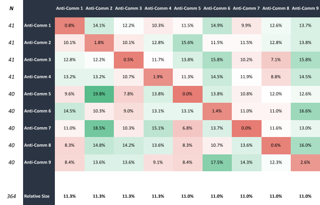 Below is a collaboration matrix by anti-community like the one above for communities. Notice the red diagonal line starting from the top left cell. Inversely to the communities, most of the anti-communities have no or relatively few internal ties.