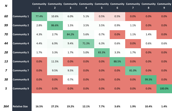 The collaboration matrix below summarizes the interactions between the different communities in the network above. The rows of the table represent the source of the connection and the columns the target. In the first row, for example, 77.4% of the nominations from members in Community 1 were to other Community 1 members, 10.6% were to Community 2, 6.0% to Community 3, and so forth. Notice the green diagonal line starting in the top left corner in relation to the other cells. Like the network image above, It shows that communication is significantly higher within the communities than between them.