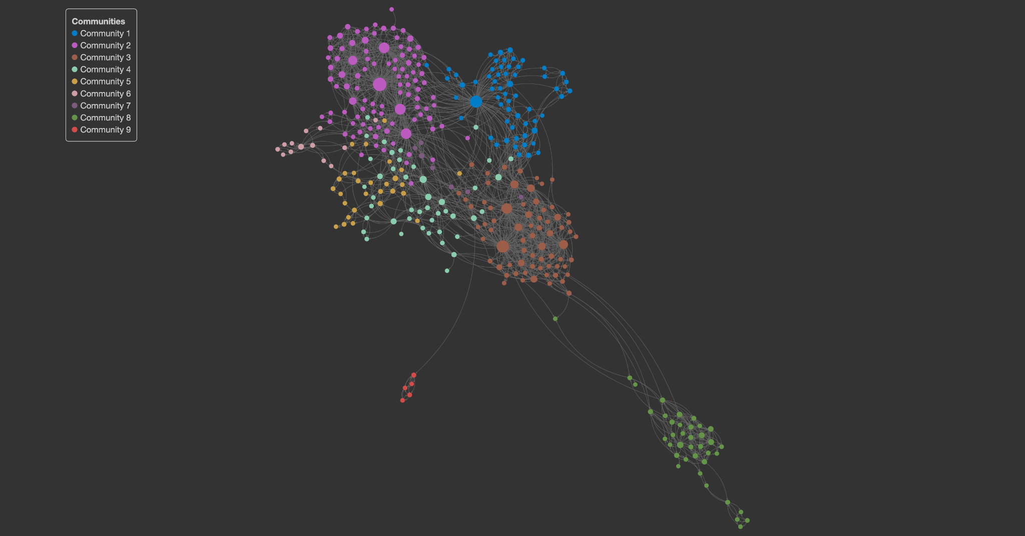 The following image shows an example network colored by community resulting from the application of the Louvain community detection algorithm. For reference, the modularity score is 0.59.